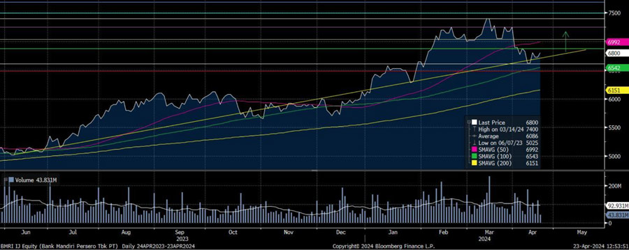 Pergerakan harga saham BMRI tengah berada di atas MA-200, MA-100 dan MA-50 setelah menembus rekor tertinggi. Saham BMRI menarik dicermati kembali di level saat ini Rp6.500 sampai Rp6.700, dengan target harga pada resistance psikologis di level Rp7.500, serta pertimbangkan cut loss apabila break support di bawah level harga Rp5.900.