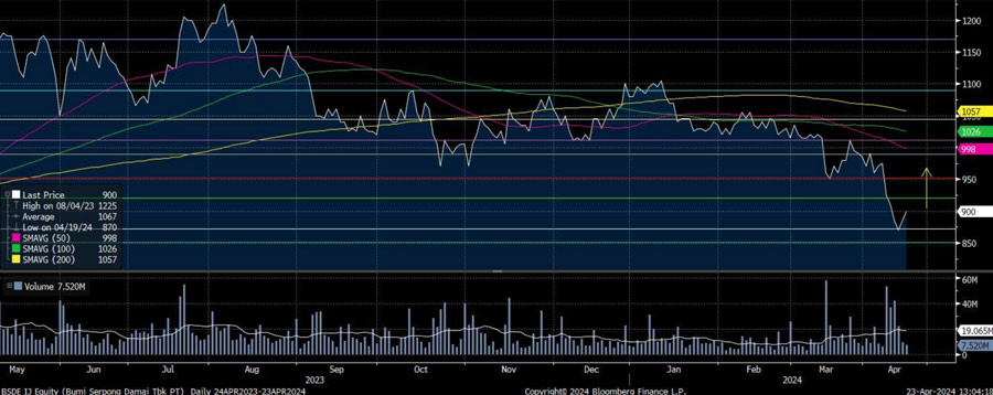 Pergerakan harga saham BSDE tengah uji support dalam tren rebound-nya, dengan ada di rentang di kisaran MA-5. Dengan itu, saham BSDE menarik dicermati di level Rp860 sampai Rp890, dengan target harga pada resistance pertama di level Rp980, sebelum kembali ke harga Rp1.000. Adapun pertimbangkan cut loss apabila break support di bawah level harga Rp840.