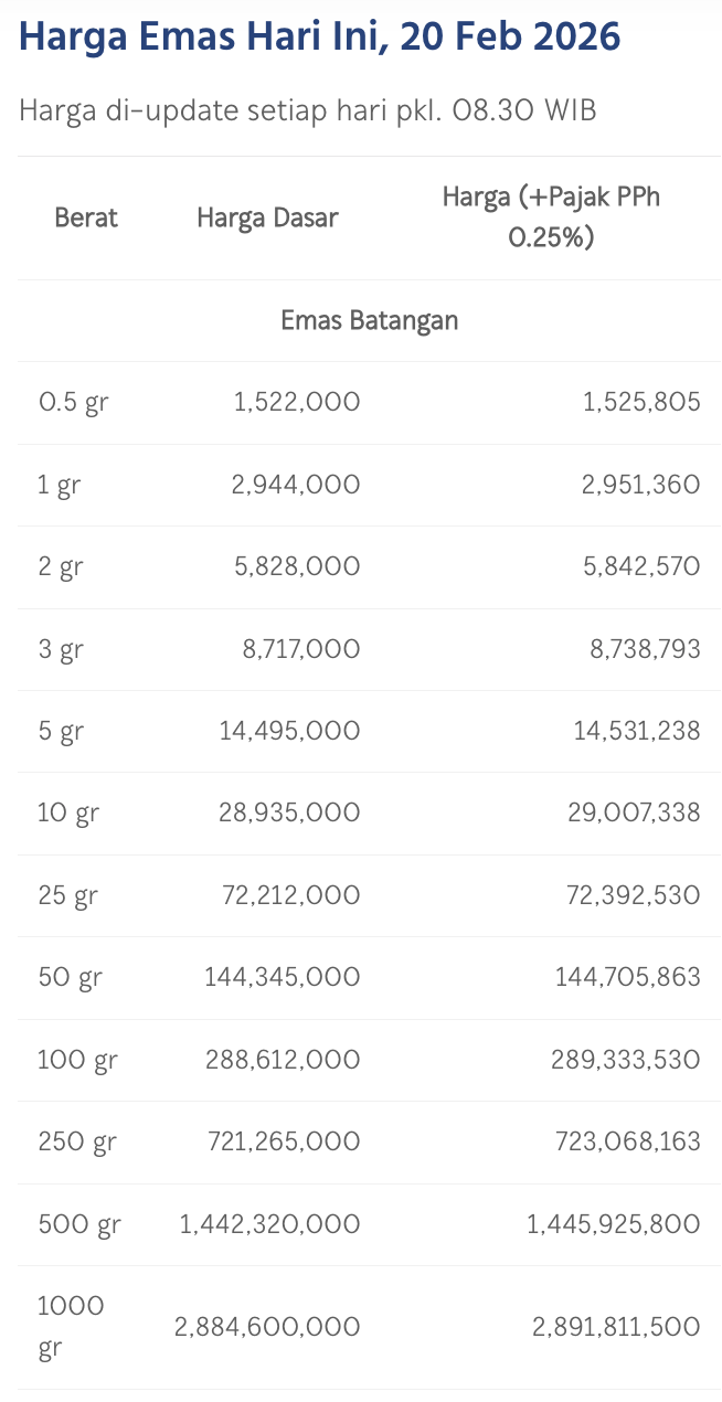 Pada Jumat (19/2/2026), emas Antam dihargai Rp 2.944.000/gram. Menguat Rp 28.000 dari posisi hari sebelumnya.