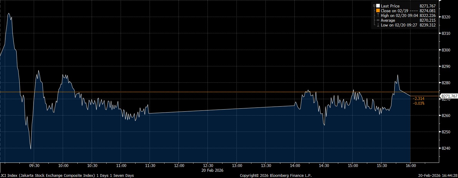 Bloomberg Technoz, Jakarta - Indeks Harga Saham Gabungan (IHSG) ditutup stagnan dengan turun tipis 2,31 poin (0,03%) di posisi 8.271,76 pada penutupan perdagangan Jumat (20/2/2026) usai berfluktuatif sejak pagi hari tadi dengan saham Merdeka Battery Materials (MBMA) jadi pemberat IHSG.