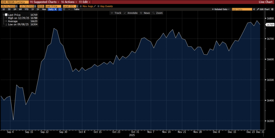 Setelah itu, nilai tukar rupiah bergerak volatil dengan kecenderungan melemah, terombang-ambing oleh sentimen akibat ketidakpastian geolpolitik yang membuat arus modal asing keluar-masuk. Jika ditarik dari September hingga Desember 2025, volatilitas rupiah itu telah mencatatkan pelemahan sebesar 2,08%.
