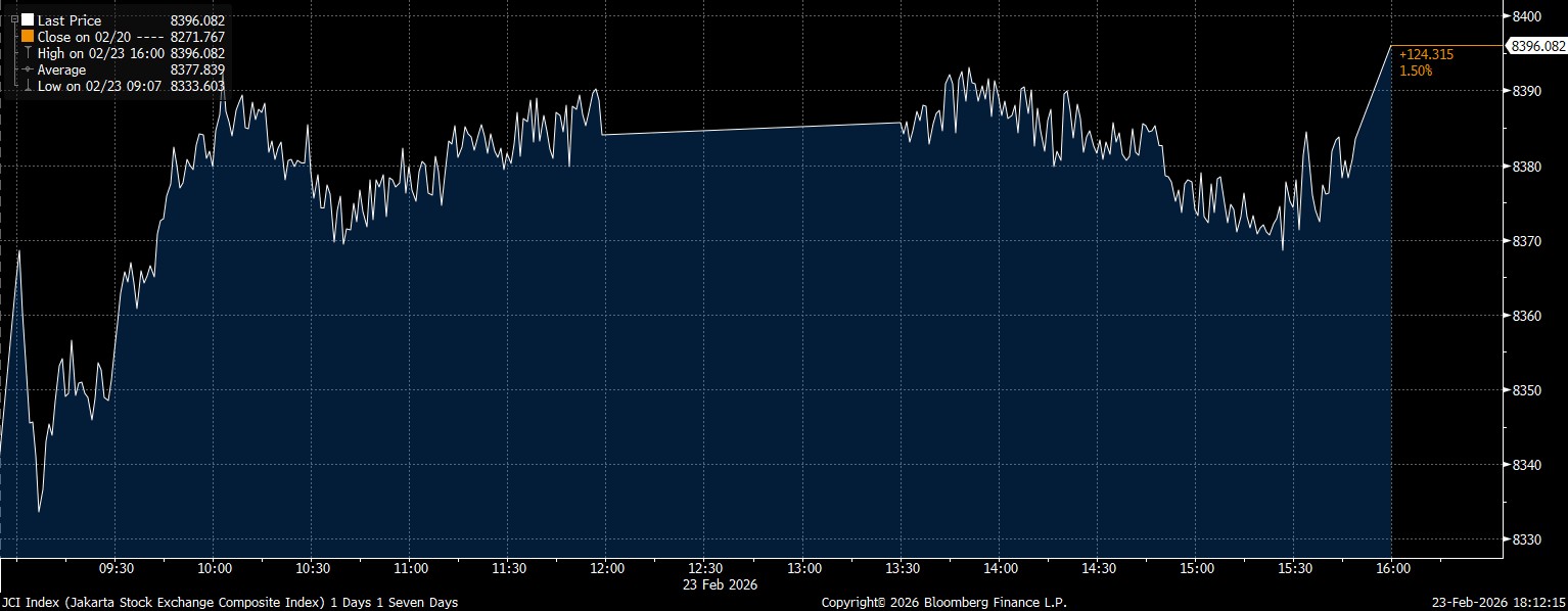 Bloomberg Technoz, Jakarta - Indeks Harga Saham Gabungan (IHSG) ditutup menguat 1,5% di posisi 8.396,08 pada Senin (23/2/2026) di tengah-tengah sentimen Anggaran Pendapatan dan Belanja Negara (APBN) 2026 RI yang mencatatkan defisit anggaran per Januari, mencapai Rp54,6 triliun.