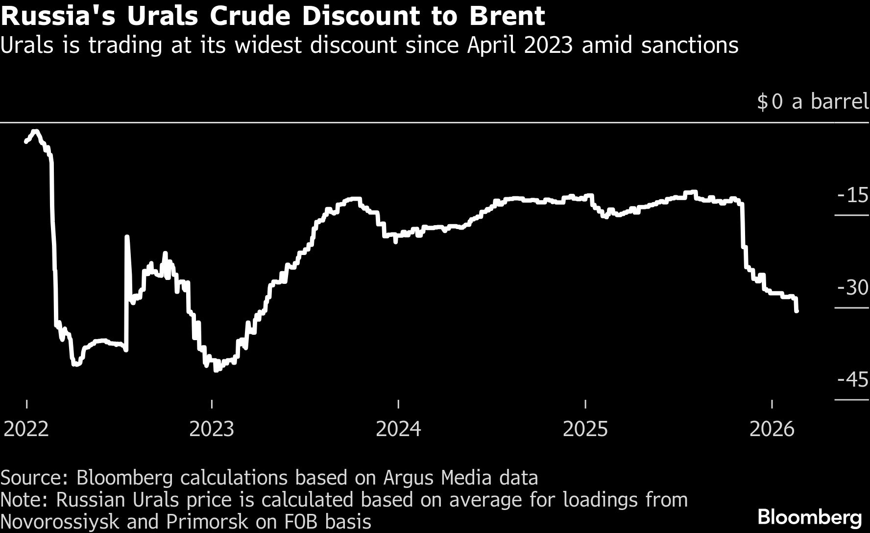 Pada saat Urals tiba di India, diskonnya terhadap Brent menyempit menjadi sekitar US$12 per barel, menurut Argus.