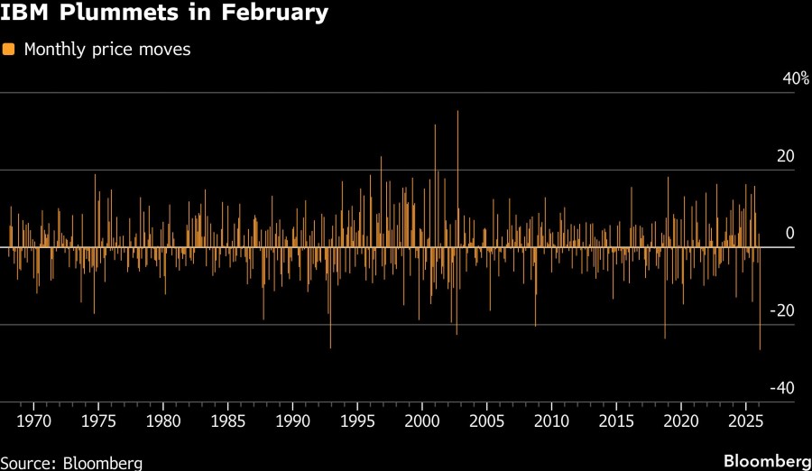 Saham IBM merosot tajam 13%, mencatatkan penurunan persentase harian terbesar sejak Oktober 2000. Dengan penurunan ini, saham IBM telah turun 27% pada Februari, menuju penurunan bulanan terbesar sejak setidaknya 1968, menurut data yang dikumpulkan oleh Bloomberg.