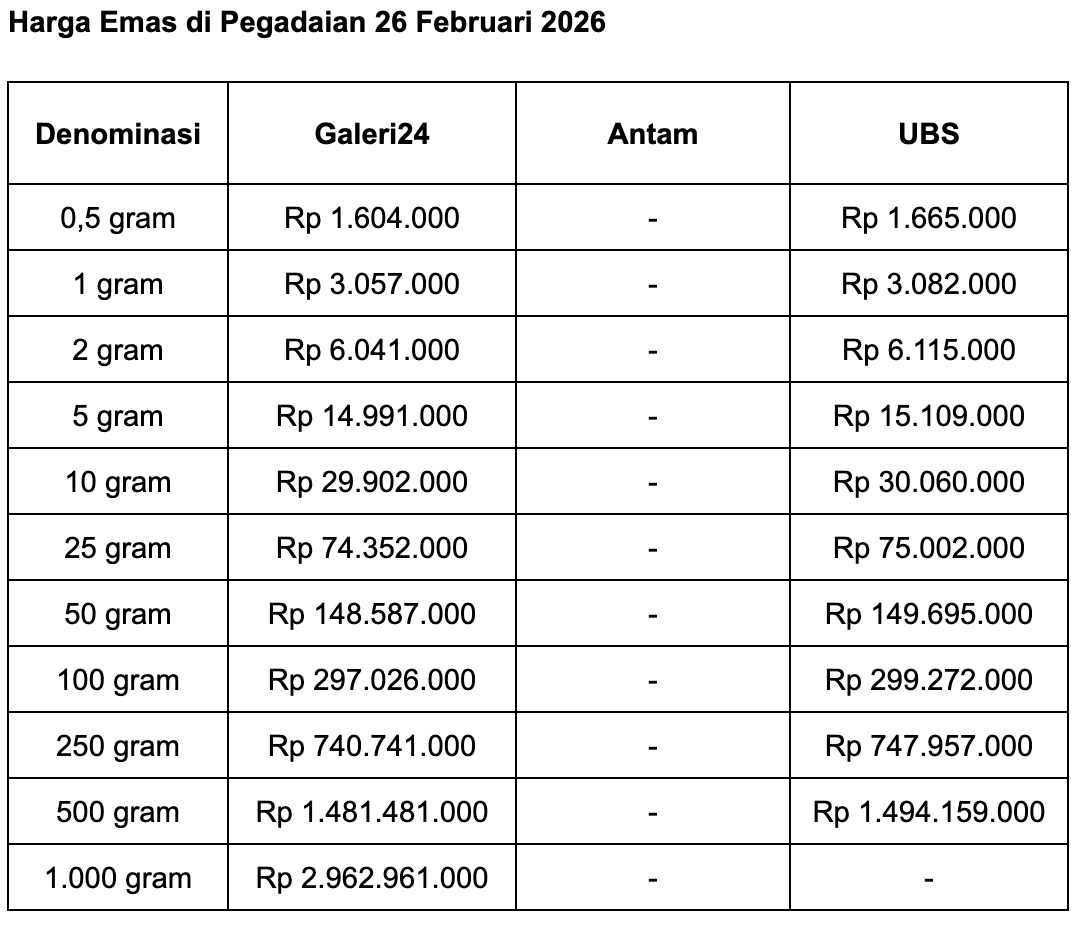 Lalu untuk emas batangan Galeri 24 ukuran 0,5 gram, Pegadaian menjual di harga Rp 1.604.000. Berkurang Rp 14.000 dalam sehari.
