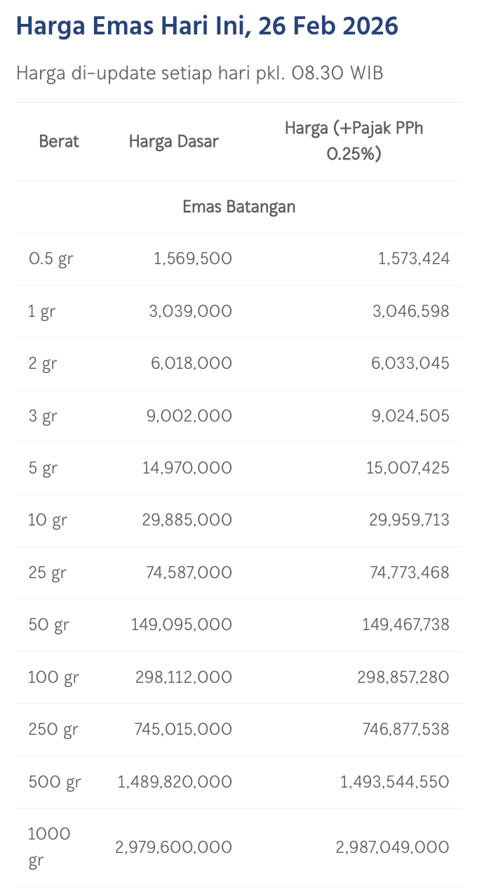 Pada Kamis (26/2/2026), emas Antam dihargai Rp 3.039.000/gram. Menguat Rp 16.000 dari posisi kemarin.