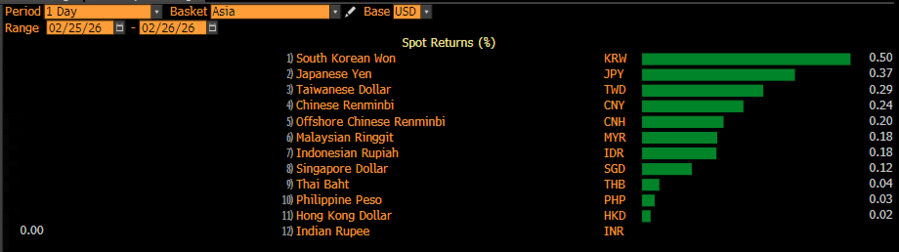 Melemahnya dolar AS membawa berkah bagi mayoritas mata uang Asia. Won Korea Selatan terapresiasi 0,41%, disusul yen Jepang 0,3%, yuan China 0,23%, ringgit Malaysia 0,19%, yuan offshore China 0,18%, dolar Taiwan 0,15%, dolar Singapura 0,11%, serta dolar Hong Kong dan baht Thailand masing-masing 0,03%.