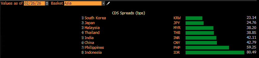 CDS Indonesia berada di level 80,49 bps, tertinggi di antara negara yang dibandingkan. Sebagai pembanding, CDS Korea Selatan hanya 23,14 bps, Jepang 24,76 bps, Malaysia 38,20 bps, Thailand 38,85 bps, India 42,11 bps, China 42,79 bps, dan Filipina 59,25 bps.