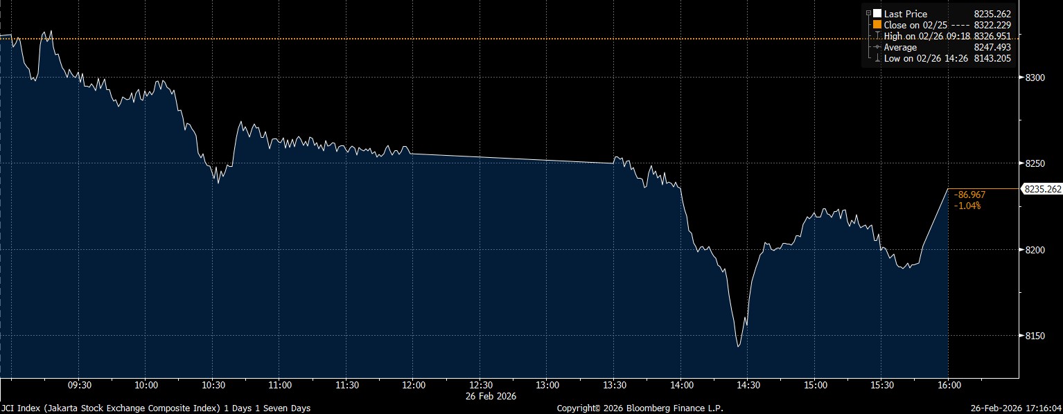 Bloomberg Technoz, Jakarta - Indeks Harga Saham Gabungan (IHSG) pada perdagangan Kamis (26/2/2026), ditutup di zona merah usai kehilangan 1,04% di posisi 8.235,26. Amblesnya saham–saham berbobot besar jadi sebab, terutama saham BUVA dan VKTR, hingga diperberat lagi oleh saham BUMI.