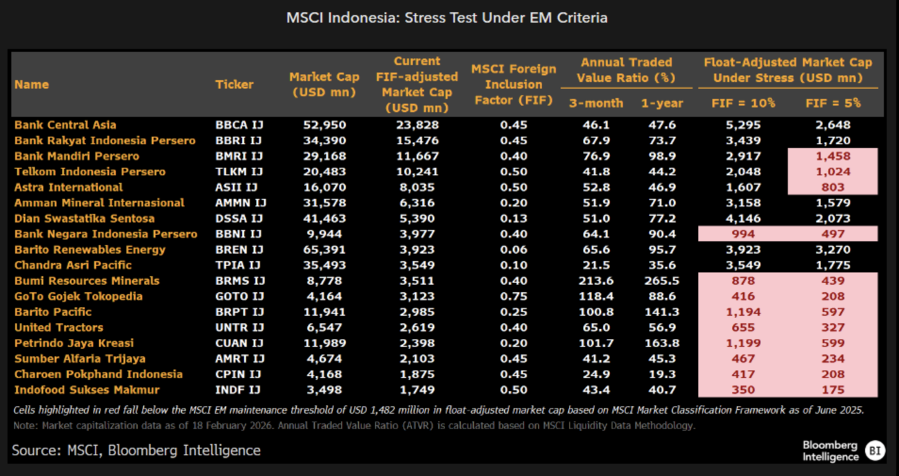 Berdasarkan simulasi yang dilakukan tim Bloomberg Intelligence, bahkan jika porsi saham yang dihitung bisa dimiliki investor asing (foreign inclusion factor) diturunkan cukup drastis, misalnya hanya 10% bahkan 5%, sejumlah saham Indonesia masih tetap memenuhi batas minimum ukuran pasar yang disyaratkan MSCI.