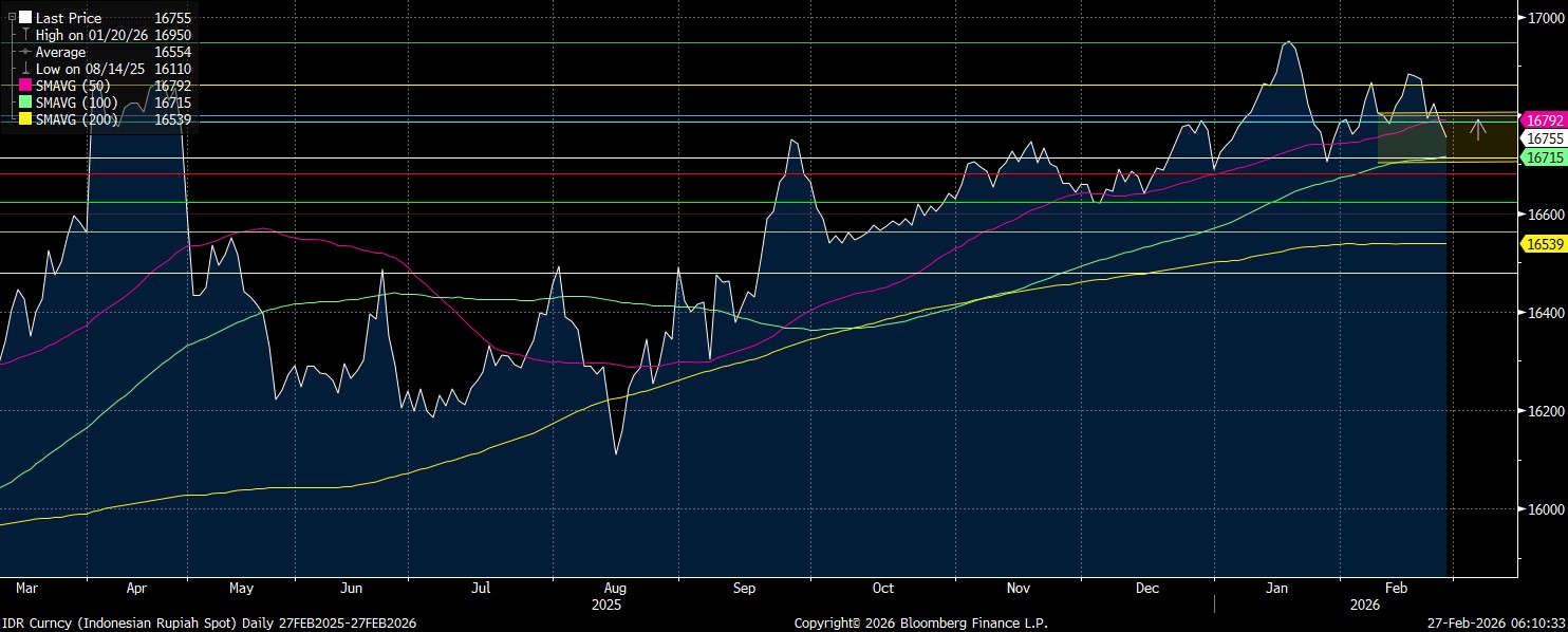 Rupiah punya target pelemahan menuju Rp16.780/US$ sampai dengan Rp16.800/US$. Level selanjutnya bisa lanjut melemah bertahap ke Rp16.860/US$ dengan tertembusnya support kuat dari posisi sebelumnya.
