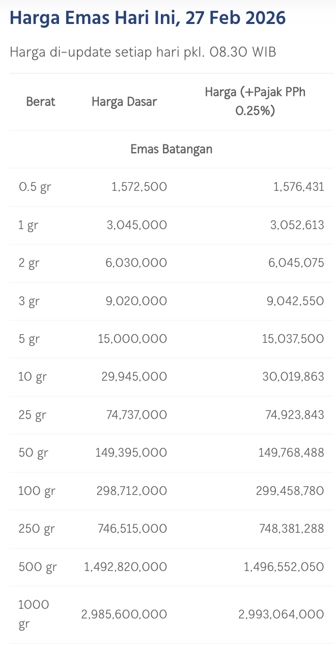 Pada Jumat (27/2/2026), emas Antam dihargai Rp 3.045.000/gram. Menguat Rp 6.000 dari posisi kemarin.