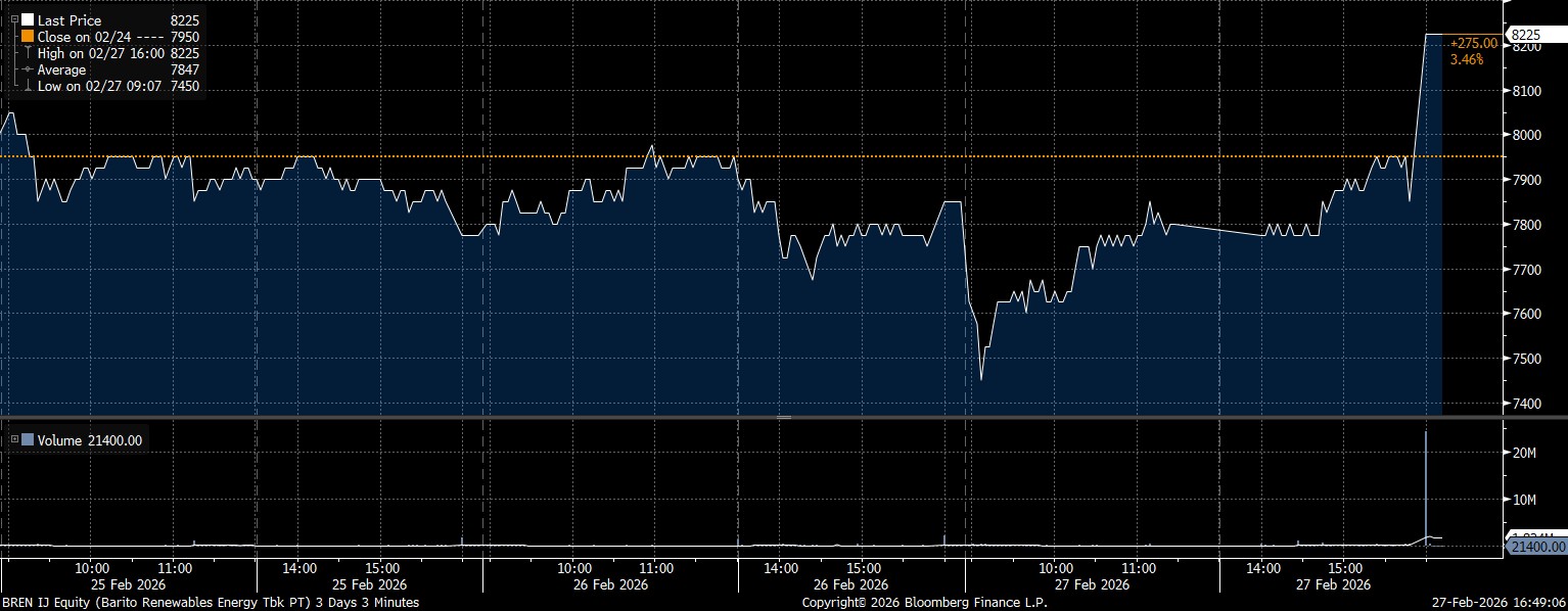 Berdasarkan data Bloomberg, Jumat (27/2/2026), saham BREN lompat 375 poin atau setara dengan kenaikan 4,77% ke level Rp8.225 per saham pada tutup perdagangan.