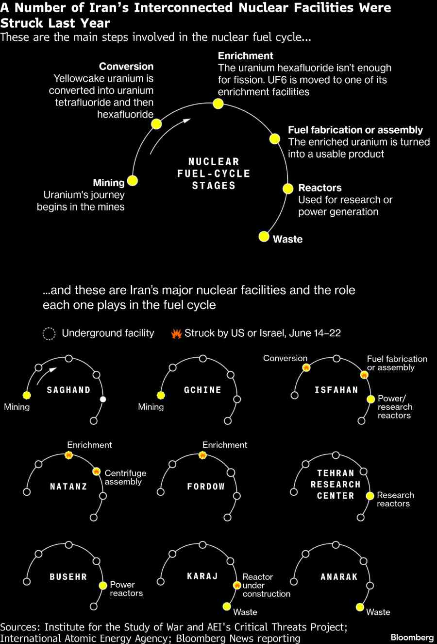 Apakah pengayaan uranium masih dapat dilakukan di dua fasilitas yang diketahui, Fordow dan Natanz, setelah diserang tahun lalu, masih menjadi pertanyaan yang belum terjawab. Citra satelit mengonfirmasi kerusakan parah di permukaan akibat bom penghancur bunker AS, dan gambar selanjutnya menunjukkan upaya rekonstruksi di atas permukaan. Namun, status operasi yang terkubur jauh di bawah tanah masih belum jelas.