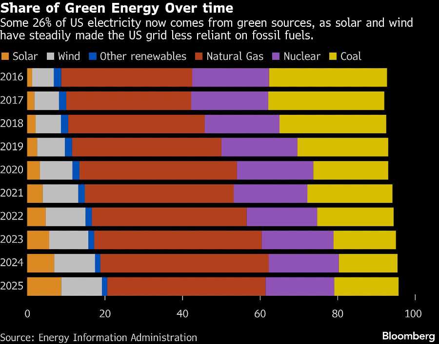 Namun, energi terbarukan tumbuh lebih cepat daripada peningkatan tersebut, didorong oleh penurunan biaya sel surya, turbin angin, dan baterai raksasa. Bahkan tanpa subsidi, instalasi energi terbarukan kini lebih murah untuk dibangun daripada alternatifnya dalam kebanyakan skenario, menurut Lazard.