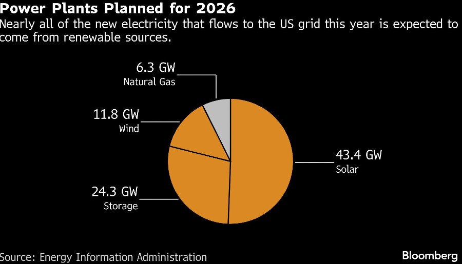 Pemerintah memperkirakan 93% kapasitas pembangkit listrik baru yang diperkirakan akan ditambah ke jaringan listrik tahun ini akan berasal dari angin, surya, dan baterai. Hal ini menempatkan energi terbarukan pada posisi untuk menghasilkan persentase yang semakin besar dari seluruh daya listrik AS.