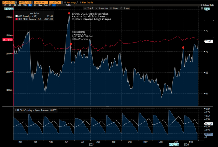 Misalnya, pada tahun lalu saat terjadi tabrakan kapal tanker oli di Selat Hormuz di tanggal 19 Juni yang memicu lonjakan harga minyak menjadi US$78,85 per barel, kemudian pada 23 Juni rupiah ikut terkerek menjadi Rp16.485/US$ dari sebelumnya Rp16.300/US$ pada tanggal 18 Juni, sehari sebelum tabrak terjadi.
