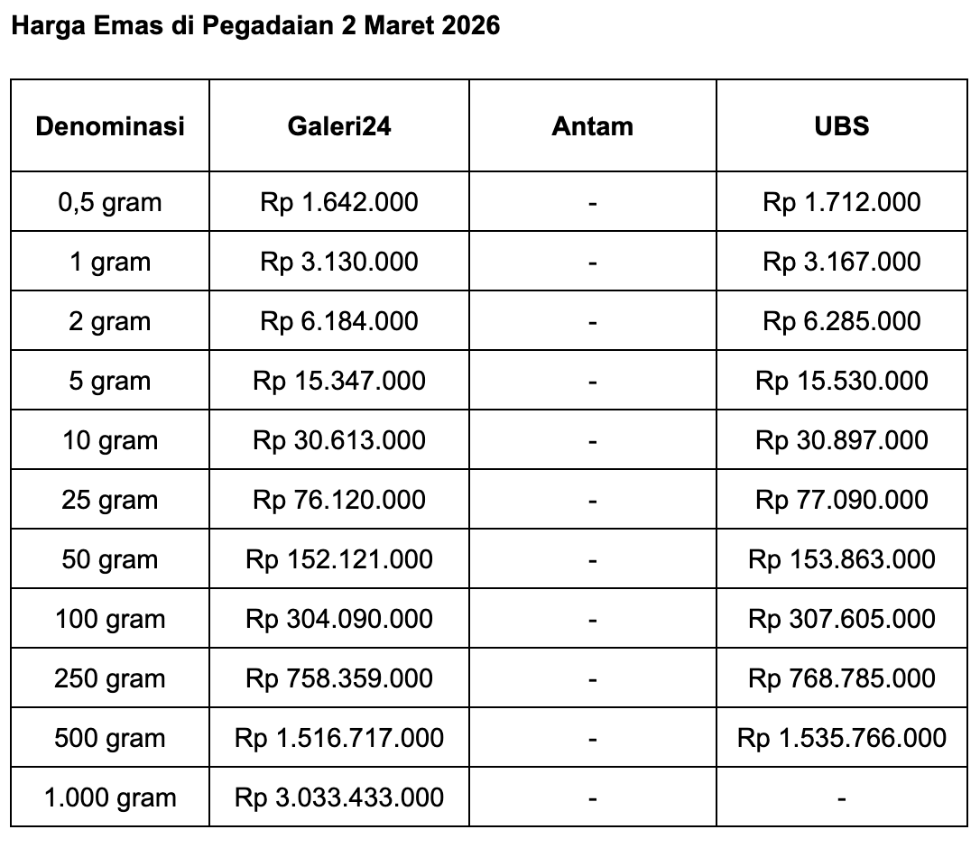 Pegadaian adalah salah satu anak usaha PT Bank Rakyat Indonesia (Persero) Tbk (BBRI). Berikut perkembangan harga emas di Pegadaian selengkapnya, seperti dilansir situs Sahabat Pegadaian: