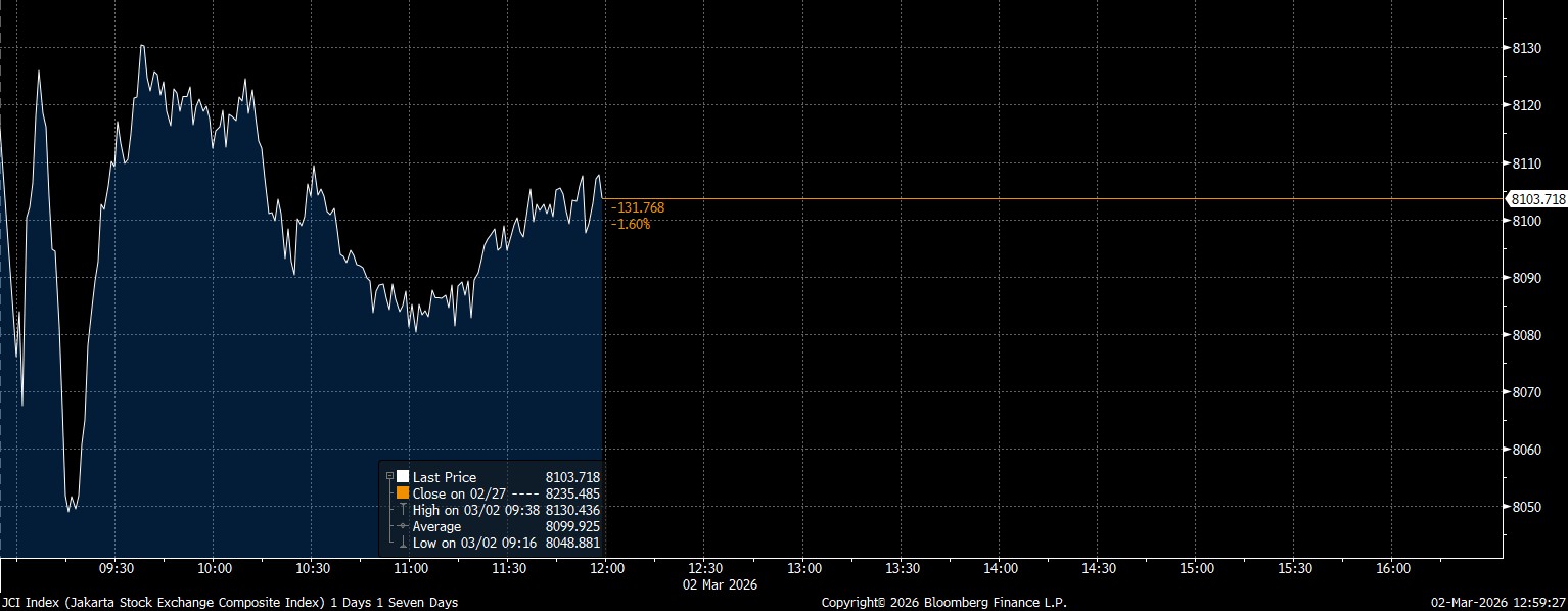 Bloomberg Technoz, Jakarta - Indeks Harga Saham Gabungan (IHSG) ditutup di zona merah pada Sesi I. IHSG melemah 1,6% di posisi 8.103,71 pada Senin (2/3/2026). Sejumlah saham energi saham minyak berikut ini justru berhasil menghijau, saham ENRG misalnya, melesat 14,2% point–to–point.