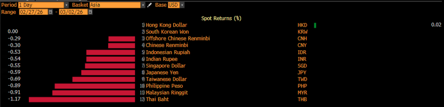 Alarm risk-off yang menyala membuat investor berduyun-duyun meninggalkan aset di pasar emerging markets. Hampir semua mata uang Asia kompak melemah, hanya dolar Hong Kong yang konsisten di zona hijau sejak pagi tadi, meski penguatannya tipis sekali.