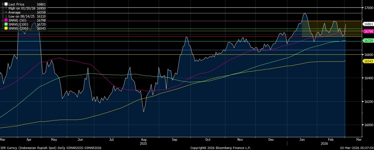 Secara teknikal, rupiah berpotensi lanjut melemah. Target pelemahan terdekat adalah Rp16.880/US$ yang merupakan support pertama dengan target pelemahan kedua akan tertahan di Rp16.900/US$.