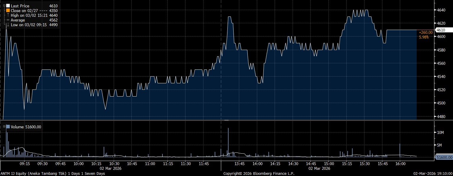 Pada kesempatan yang sama, investor asing mencatat net buy terbesar pada saham PT Aneka Tambang Tbk (ANTM) mencapai Rp156,6 miliar. Seiringan dengan tren pembelian, saham ANTM menguat 5,98% menuju posisi Rp4.610/saham.