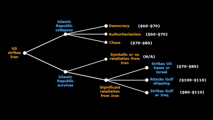 Namun, hal itu bergantung serangan yang menargetkan infrastruktur energi atau mengganggu aliran melalui Selat Hormuz. Fokus utama jangka pendek adalah kerusakan yang telah dikonfirmasi pada aset ekspor seperti Pulau Kharg dan transit kapal tanker melalui Hormuz.