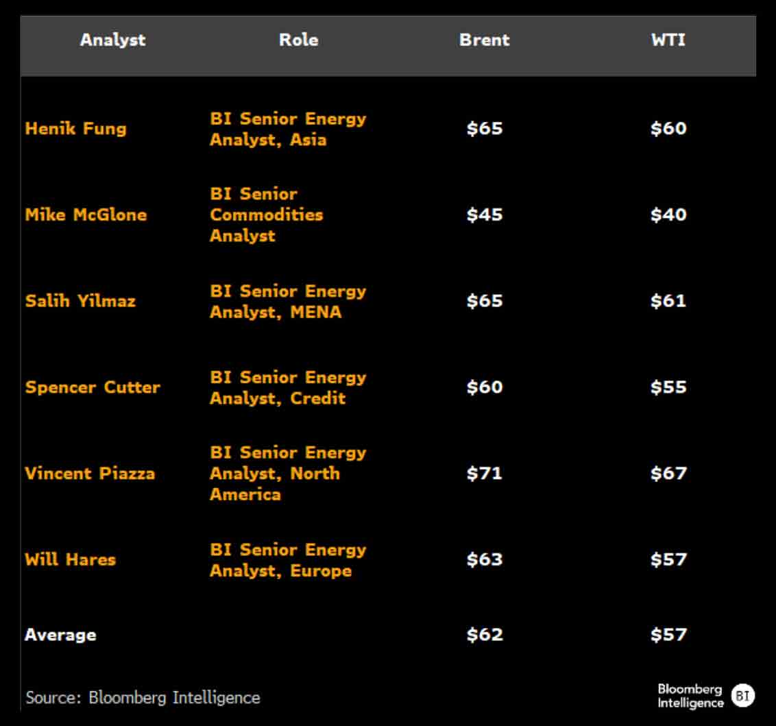 Bloomberg Intelligence memperkirakan selama enam bulan ke depan harga Brent bisa berada di level rendah US$60/barel, dan US$50/barel hingga US$60-an untuk West Texas Intermediate (WTI).