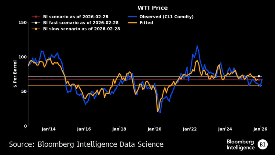 Nilai wajar WTI diperkirakan sebesar US$67/barel, secara umum sejalan dengan harga terkini, mencerminkan pandangan bahwa inflasi harga minyak tambahan dari konflik Timur Tengah mungkin bersifat sementara kecuali infrastruktur energi atau rute transit utama seperti Selat Hormuz mengalami kerusakan parah.