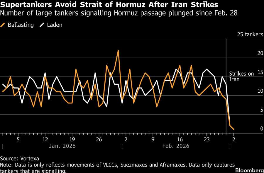 Data dari platform pelacakan kapal Vortexa menunjukkan hanya empat kapal tanker besar yang melintas pada 1 Maret, turun dari 22 kapal sehari sebelumnya.