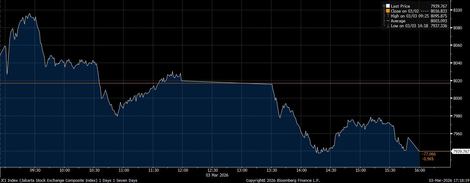 Bloomberg Technoz, Jakarta - Indeks Harga Saham Gabungan (IHSG) ditutup di zona merah dengan pelemahan 0,96% di posisi 7.939,76 pada perdagangan Selasa (3/3/2026).