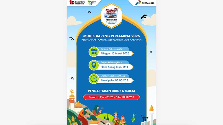 Pendaftaran resmi akan dibuka mulai Selasa, 3 Maret 2026 pukul 10.00 WIB. Masyarakat dapat mendaftar secara daring melalui situs resmi www.mudikpertamina2026.com untuk mendapatkan fasilitas perjalanan mudik gratis.