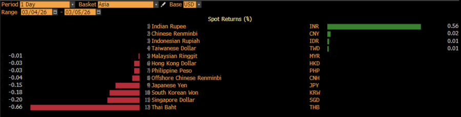 Indeks dolar AS kembali terapresiasi 0,22% ke 98,98, dan menyeret baht Thailand, won Korea Selatan, ringgit Malaysia, dolar Taiwan, yuan offshore China, rupiah, dan dolar Hong Kong, serta yuan China ke zona merah. Sebaliknya rupee India menguat paling dominan sore ini sebesar 0,57% setelah bank sentral India menjual dolar AS baik di pasar offshore maupun onshore.