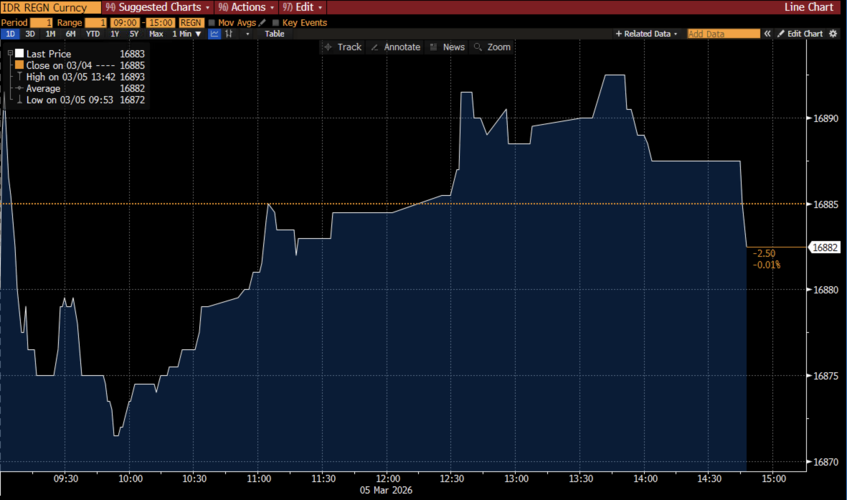 Bloomberg Technoz, Jakarta - Pergerakan rupiah stagnan dalam penutupan di pasar spot hari ini (5/3/2026) dan dibanderol di level Rp16.883/US$. Rupiah sempat dibuka di posisi Rp16.880/US$ tadi pagi, menyusul lemahnya beberapa mata uang Asia yang menjadi jangkar rupiah dan menguatnya indeks dolar AS.