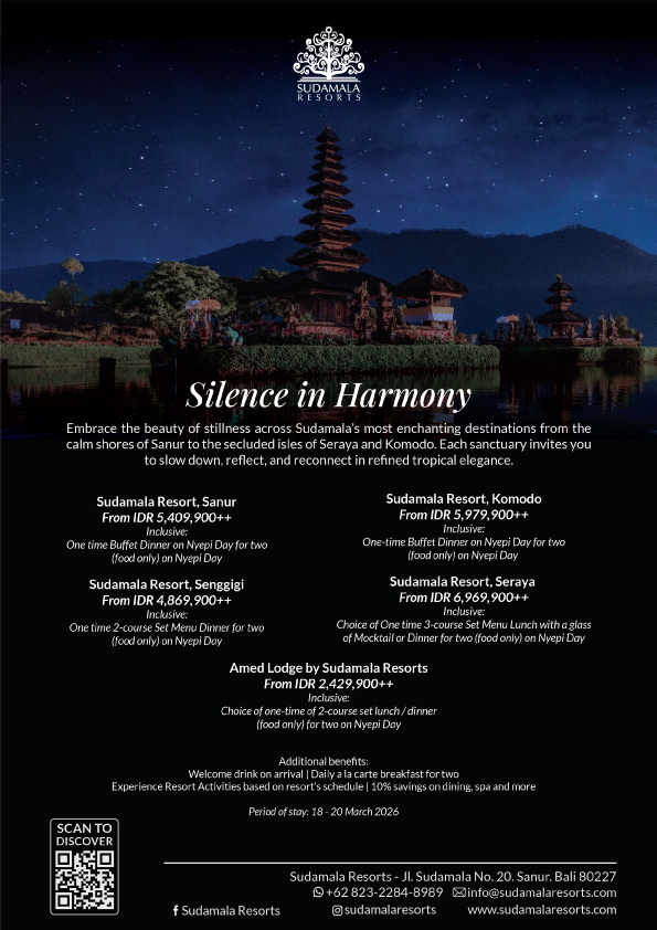Program ini dirancang sebagai pengalaman menginap yang mendalam dan memulihkan, memadukan kenyamanan berkelas dengan sentuhan lokal autentik di setiap destinasi. Para tamu diajak menikmati suasana reflektif khas Nyepi dalam lingkungan yang tenang dan tanpa gangguan, selaras dengan filosofi mindful luxury yang menjadi identitas Sudamala Resorts.