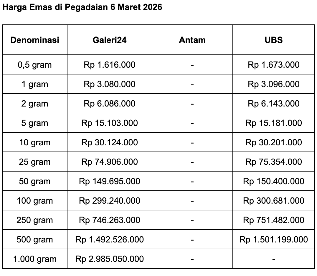 Adapun untuk ukuran 1 gram, harga emas Galeri 24 di Pegadaian adalah Rp 3.080.000. Terangkat Rp 5.000 ketimbang harga kemarin.
