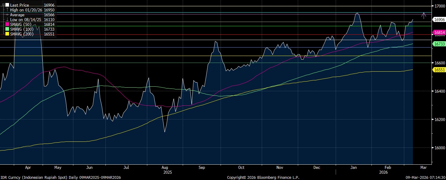 Secara teknikal, rupiah berpotensi lanjut melemah pada perdagangan hari ini. Target pelemahan menuju Rp16.940/US$ sampai dengan Rp16.960/US$.
