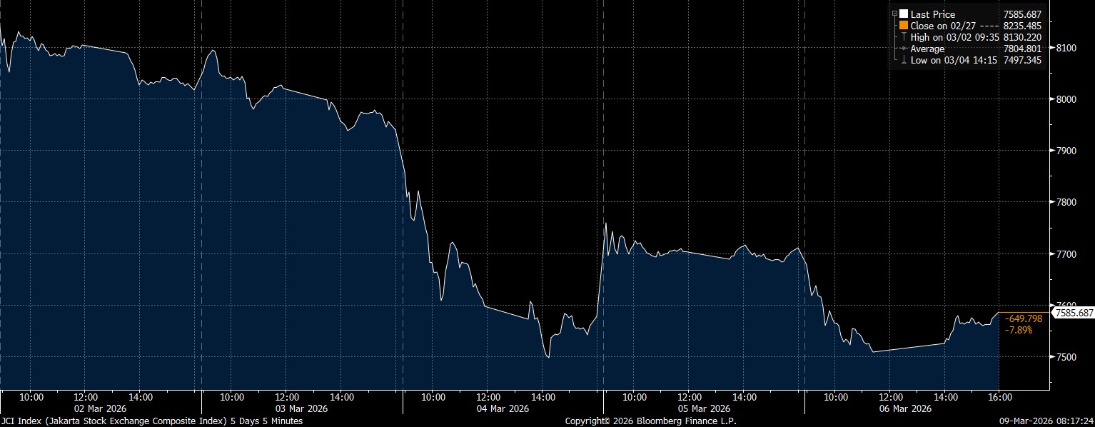 Bloomberg Technoz, Jakarta - Indeks Harga Saham Gabungan (IHSG) ditutup di zona merah pada perdagangan sepekan hingga Jumat (6/3/2026). IHSG melemah 7,89% di posisi 7.585,68. Lantas bagaimana dengan rekomendasi saham hari ini?
