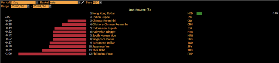 Penguatan ini membuat mayoritas mata uang Asia melemah. Peso Filipina melemah paling tajam, disusul baht Thailand, won Korea Selatan, yen Jepang, dolar Taiwan dan Singapura, serta ringgit Malaysia. Begitu juga dengan yuan baik offshore maupun spot. Sebaliknya hanya dolar Hong Kong yang tercatat di zona hijau, itupun hanya 0,10%.