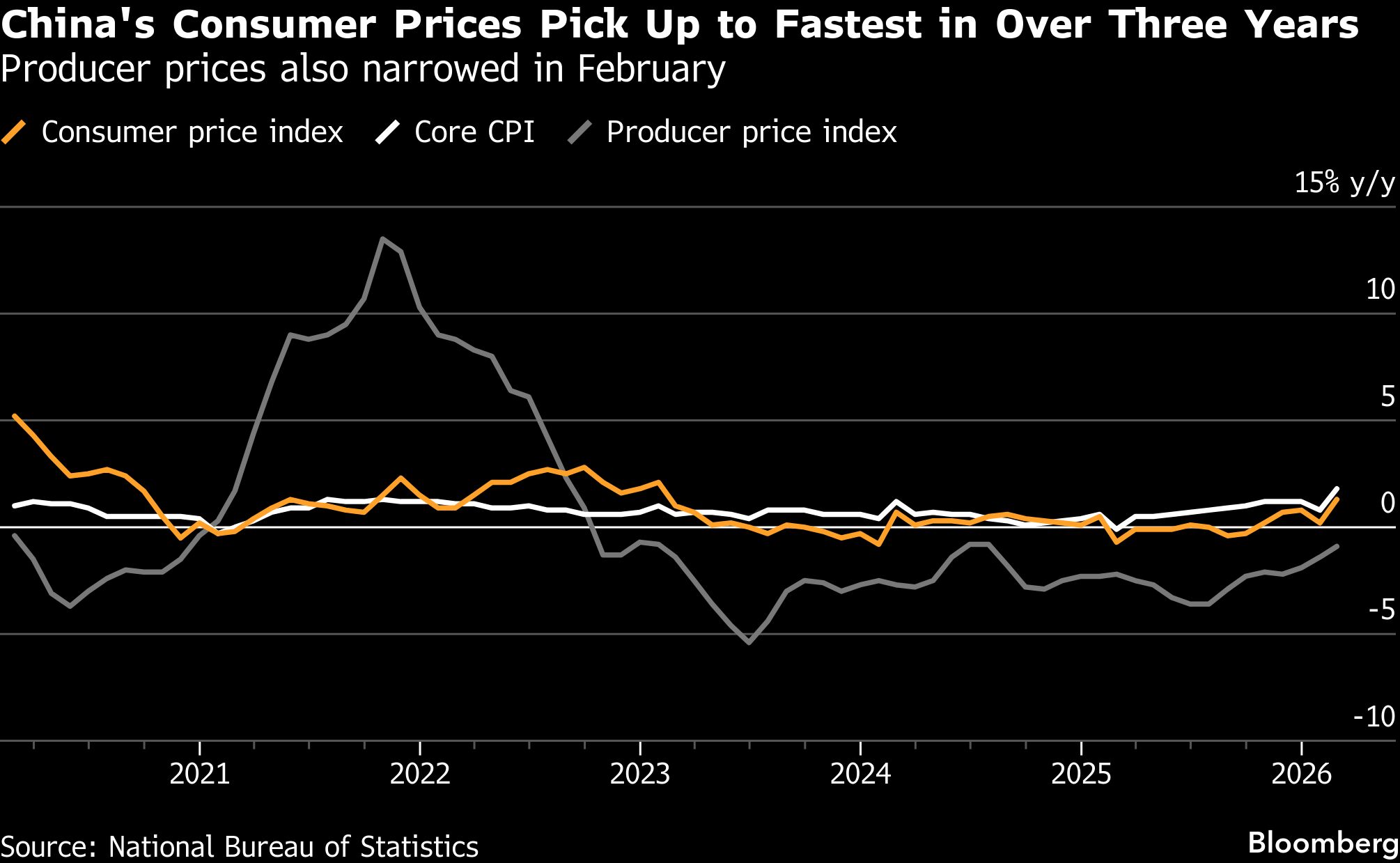 Bloomberg, Pertumbuhan harga konsumen di China meningkat ke level tercepat dalam lebih dari tiga tahun terakhir. Data terbaru menunjukkan deflasi di sektor pabrik mulai mereda, didorong oleh reli pasar energi global serta ledakan pengeluaran rumah tangga selama libur Tahun Baru Imlek yang jatuh lebih lambat tahun ini.