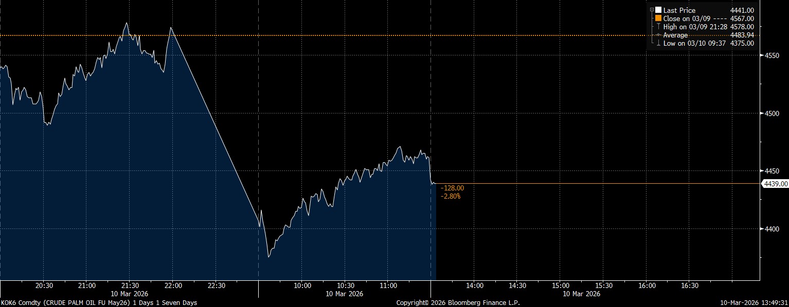 Pada Selasa (10/3/2026) per siang hari pukul 13.50 WIB, harga CPO di Bursa Malaysia Derivatives Exchange untuk kontrak pengiriman Mei tengah berada di posisi MYR 4.439/ton. Turun 2,81% dibanding hari sebelumnya.