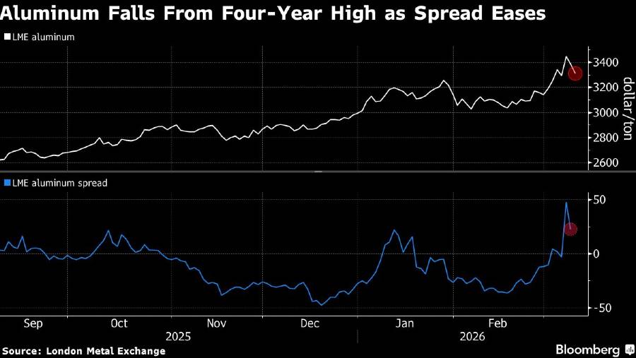 Harga aluminium turun pada Senin di tengah aksi jual di pasar keuangan, setelah sebelumnya mencapai US$3.544 per ton, level tertinggi sejak Maret 2022. Selisih harga tunai dan kontrak tiga bulan aluminium juga menurun menjadi US$22,47 per ton pada Senin, dari level tertinggi US$59 sebelumnya dalam sesi tersebut, menandakan bahwa kekhawatiran atas pasokan spot mulai mereda.