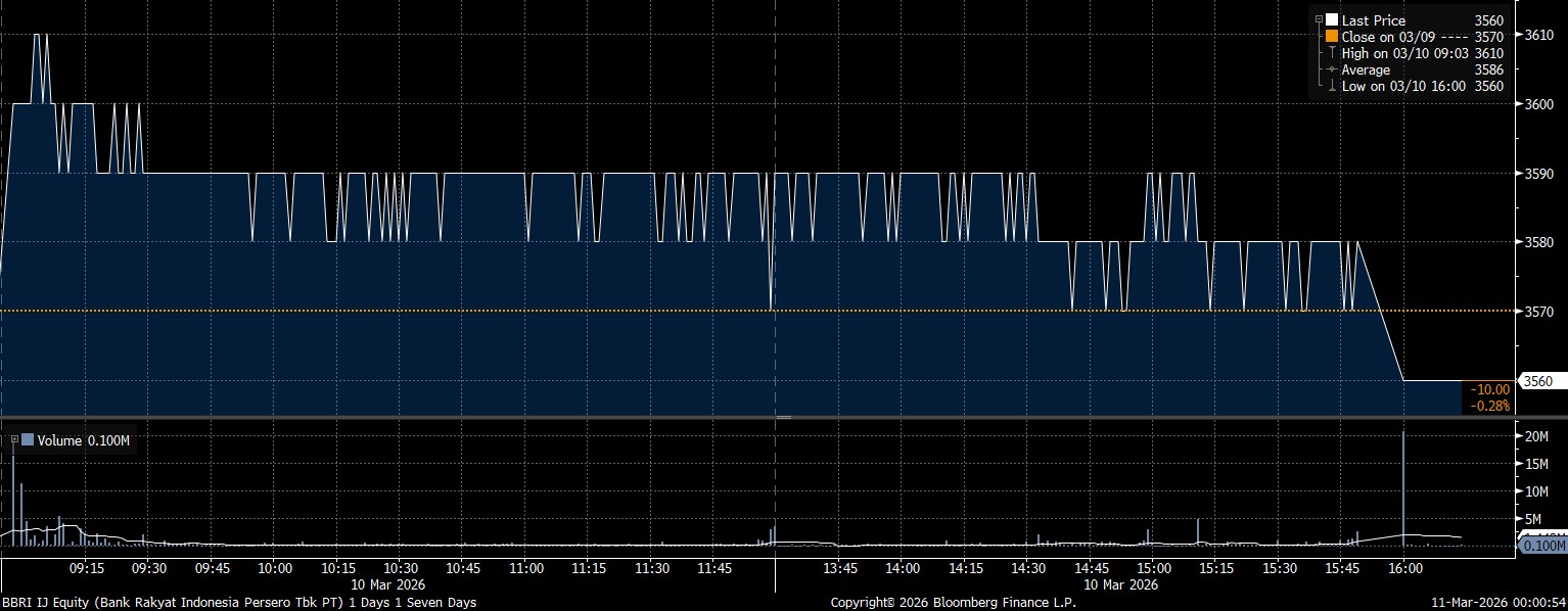 Adapun investor asing net sell yang deras terhadap saham PT Bank Rakyat Indonesia Tbk (BBRI) mencapai Rp434,42 miliar. Imbas manuver jual, saham BBRI melemah 0,28% hingga berada di posisi Rp3.560/saham.