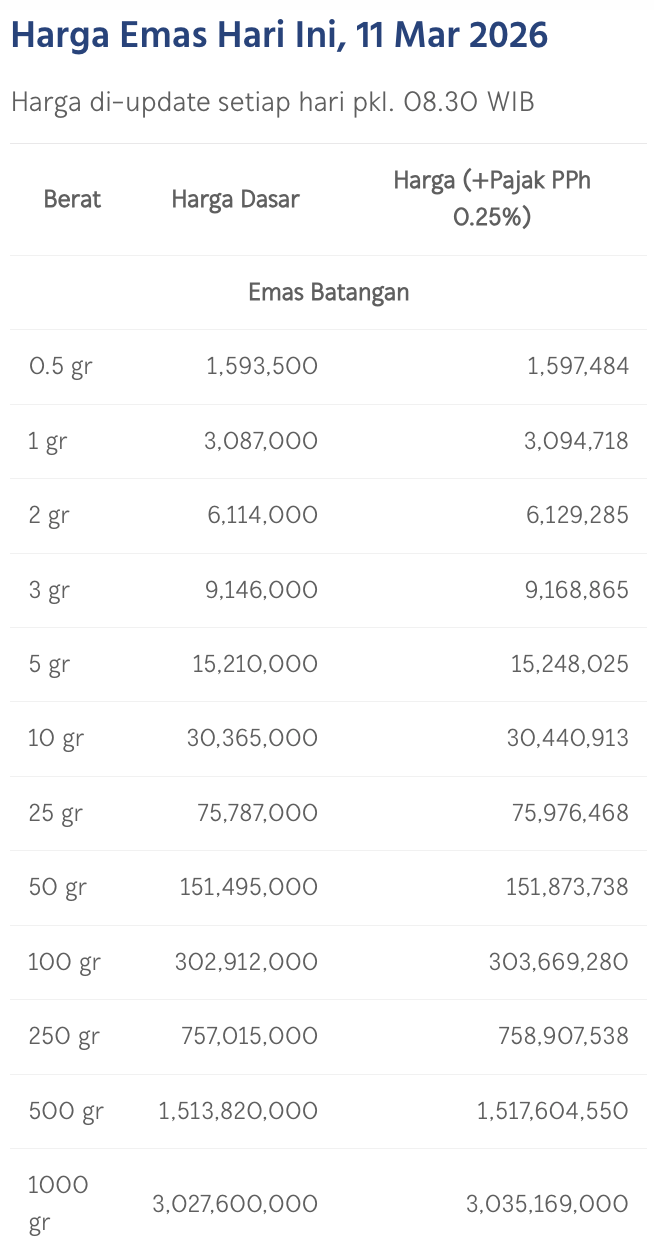 Pada Rabu (9/3/2026), emas Antam dihargai Rp 3.087.000/gram. Menguat Rp 40.000 dari posisi kemarin.