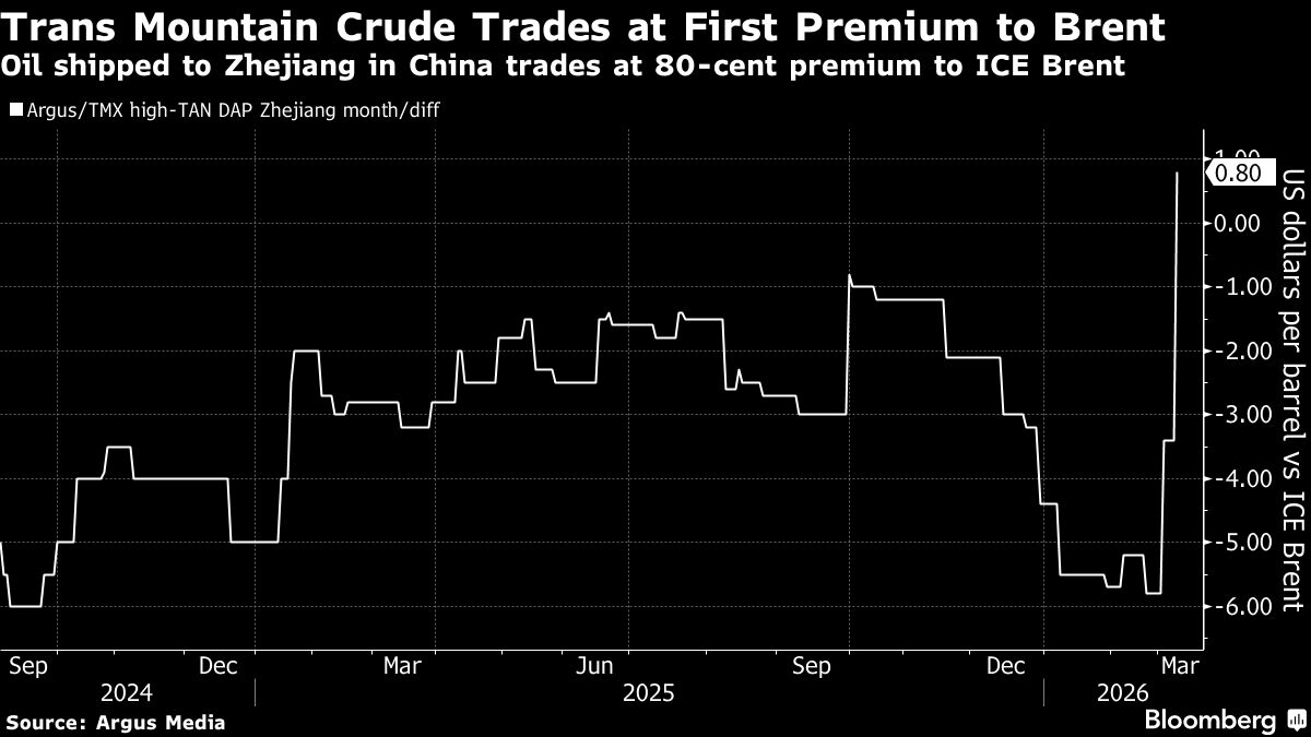 Pada Senin, minyak mentah berat yang dikirim dari pipa Trans Mountain ke China diperdagangkan dengan harga premium 80 sen terhadap ICE Brent untuk pertama kalinya sejak Argus Media memperkenalkan harga tersebut pada September 2024.