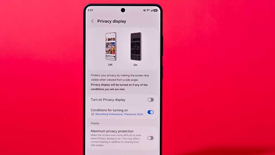 Meski memiliki Privacy Display, namun tidak mengurangi kejernihan layer dan bisa diaktifkan hanya untuk aplikasi tertentu seperti bank, email, Slack, atau password manager. Tentu saja hal ini memberikan peningkatan keamanan yang nyata saat menggunakan ponsel di tempat umum.