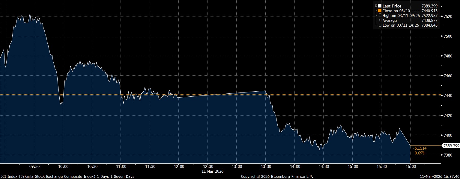 Bloomberg Technoz, Jakarta - Indeks Harga Saham Gabungan (IHSG) ditutup melemah 0,69% di posisi 7.389,39 pada perdagangan Rabu (11/3/2026). Saham PT Adaro Andalan Indonesia Tbk (AADI) dan PT Indo Tambangraya Megah Tbk (ITMG) jadi pemberat.