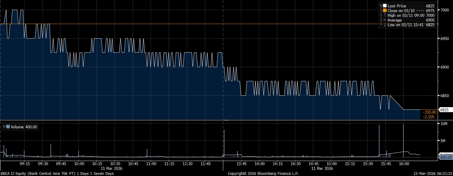 Adapun investor asing net sell yang deras terhadap saham PT Bank Central Asia Tbk (BBCA) mencapai Rp261,93 miliar. Imbas manuver jual yang masif, saham BBCA melemah 2,15% di posisi Rp6.825/saham.