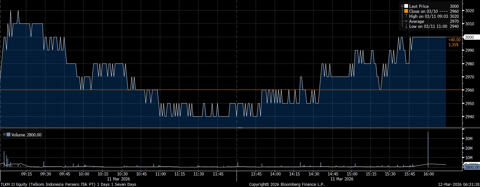 Pada kesempatan yang sama, investor asing mencatat net buy terbesar pada saham PT Telkom Indonesia Tbk (TLKM) mencapai Rp160,54 miliar. Seiringan dengan tren pembelian, saham TLKM menguat 1,35% di posisi Rp3.000/saham.