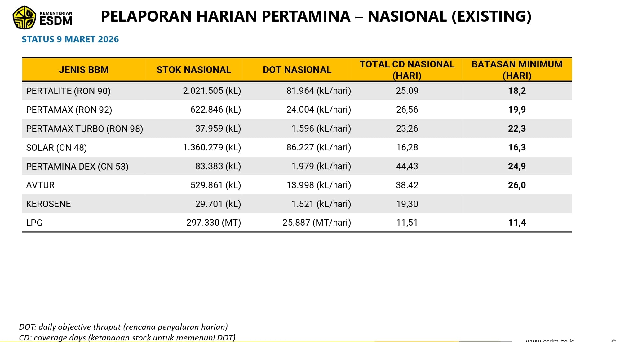 Dalam kesempatan itu, berdasarkan bahan tayangan Laode yang ditampilkan, stok operasional BBM, avtur hingga liquified petroleum gas (LPG) milik PT Pertamina (Persero) per 9 Maret 2026 dalam kondisi terjaga atau di atas standar kecukupan nasional.